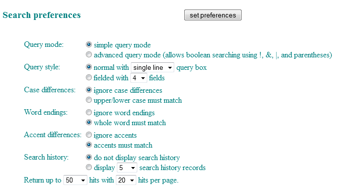 - Press the Set Preferences button and click on the Search link in the navbar. Now the SQL fielded search form should display.
